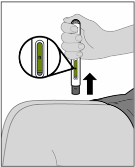 Merk: Hvis den olivengrønne stempelstangen ikke fyller vinduet helt, mottok du ikke hele dosen. Ikke bruk pennen på nytt i dette tilfellet. Ring helsepersonalet umiddelbart.