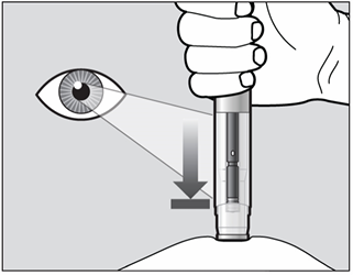 Trykk på den grønne aktiveringsknappen for å starte injeksjonen. En klikkelyd indikerer at injeksjonen starter. Hold inne den grønne knappen og fortsett å holde den ferdigfylte pennen bestemt trykket mot huden (se figur J). Dersom du ikke får til å starte injeksjonen må du spørre om hjelp fra en omsorgsperson eller rådføre deg med helsepersonell.