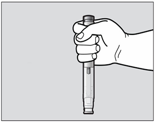 Hold den ferdigfylte pennen komfortabelt i én hånd ved å holde i den øvre delen, slik at du kan se vinduet på den ferdigfylte pennen (se figur F).