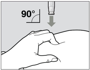 Plasser nålebeskyttelsen på den ferdigfylte pennen mot den sammenklemte huden med en vinkel på 90 grader (se figur H).