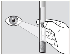 Hold den ferdigfylte pennen komfortabelt i én hånd ved å holde i den øvre delen, slik at du kan se vinduet på den ferdigfylte pennen (se figur F).