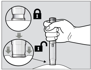 Trykk på den grønne aktiveringsknappen for å starte injeksjonen. En klikkelyd indikerer at injeksjonen starter. Hold inne den grønne knappen og fortsett å holde den ferdigfylte pennen bestemt trykket mot huden (se figur J). Dersom du ikke får til å starte injeksjonen må du spørre om hjelp fra en omsorgsperson eller rådføre deg med helsepersonell.