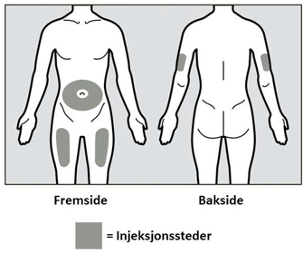 Anbefalte injeksjonssteder er foran på låret eller magen, unntatt et område på 5 cm rundt navlen (se figur D).