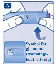 Dersom pennen allerede er tatt i bruk, skal du gå til trinn 3 «Velge dose». Kontroller kun gjennomstrømningen før din første injeksjon med enhver ny penn.