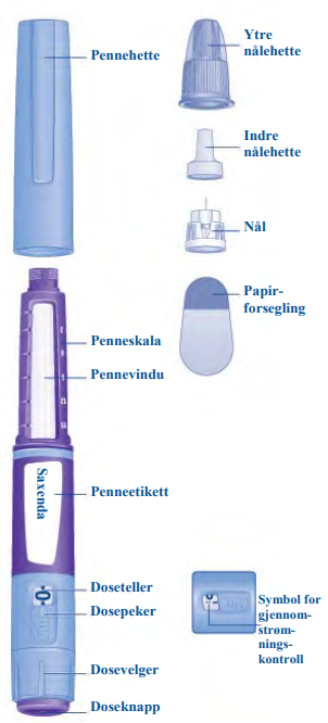 Start med å kontrollere pennen for å være sikker på at den inneholder Saxenda 6 mg/ml, se deretter på illustrasjonene nedenfor for å bli kjent med de ulike delene av pennen og nålen.