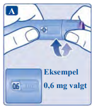 Ikke bruk penneskalaen. Den viser kun omtrent hvor mye oppløsning som er igjen i pennen. Kun doser på 0,6 mg, 1,2 mg, 1,8 mg, 2,4 mg eller 3,0 mg kan velges med dosevelgeren. Den valgte dosen må være nøyaktig på linje med dosepekeren for å sikre at du får riktig dose.