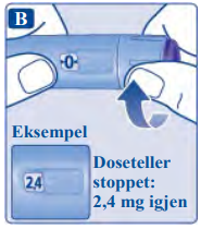 Hvis den viser 3,0, er det minst 3,0 mg igjen i pennen. Hvis dosetelleren stopper før 3,0 mg, er det ikke nok oppløsning igjen til en full dose på 3,0 mg.