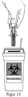 Kast den ferdigfylte sprøyten i en kanylebøtte med en gang. Forsikre deg om at bøtten destrueres som instruert av lege eller sykepleier.