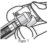Injiser alt legemiddel ved å trykke inn stempelet til stempelhodet er helt nede mellom kanylebeskyttelsesvingene (se figur 7).