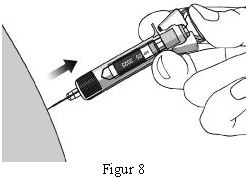 Når stempelet er trykket inn så langt det er mulig, behold trykket på stempelet samtidig som du trekker kanylen ut av huden (se figur 8).