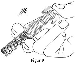 Ta tommelen langsomt vekk fra stempelhodet og la den tomme ferdigfylte sprøyten skli tilbake til kanylen er fullstendig dekket av kanylebeskyttelsen som vist i figur 9.