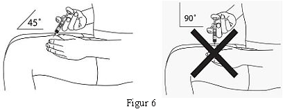 Plasser sprøyten i ca. 45 graders vinkel til hudfolden. Med en rask enkelbevegelse stikkes nålen inn gjennom huden så langt som det går (se figur 6).