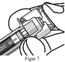 Injiser alt legemiddel ved å trykke inn stempelet til stempelhodet er helt nede mellom kanyle-beskyttelsesvingene (se figur 7).