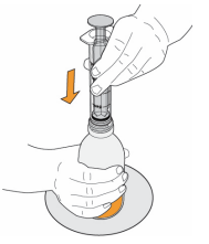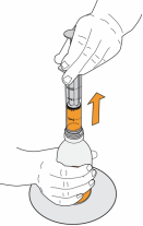 Snu flasken forsiktig opp ned og trekk i stempelet for å måle opp dosen din. Med tuppen vendt opp må toppen av den svarte gummiproppen være på linje med den forskrevne dosen.
