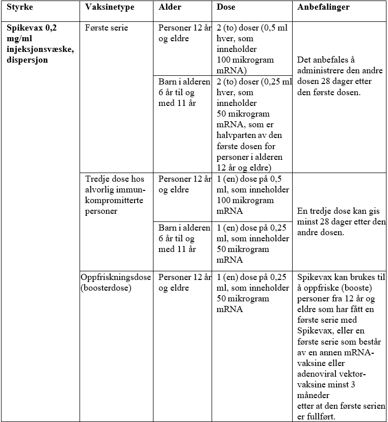 3. Hvordan du bruker SpikevaxTabell 1. Spikevax-dosering i første serie, en tredje dose ved alvorlig immunsvekkelse og oppfriskningsdose (boosterdose)