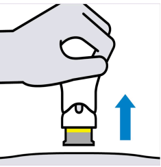 IKKE LØFT OPP DEN FERDIGFYLTE PENNEN under injeksjon! Hvis du gjør det, låses kanylebeskyttelsen, et gult bånd vises og du får ikke tatt hele dosen. |