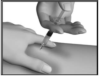4. Fortsett å holde huden og press inn sprøytestemplet for å injisere legemidlet langsomt og jevnt helt inn.