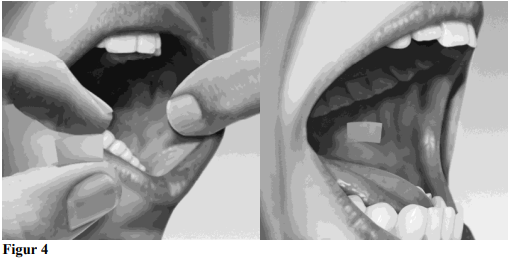 Drikk vann for å fukte munnen. Hold filmen mellom to fingre i ytterkantene og legg en film på innsiden av høyre eller venstre kinn (se figur 4).