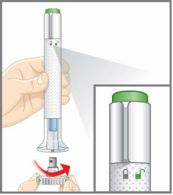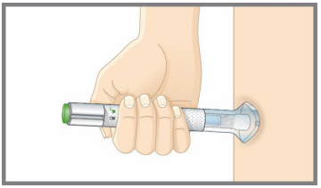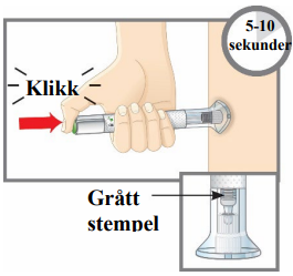 Noen pasienter kan høre et svakt klikk rett før det andre tydelige klikket. Dette er normalt. Ikke fjern den ferdigfylte pennen fra huden din før du hører det andre tydelige klikket.