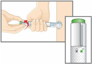 Fortsett å holde bunnplaten mot huden din, og vri låseringen over i ulåst posisjon. Du er nå klar til å injisere. |