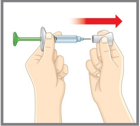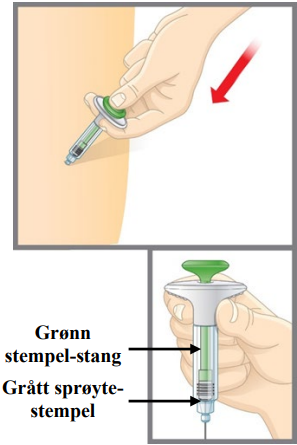 Press stempelet sakte inn, helt til alt legemidlet er injisert. Det grå sprøytestempelet skal presses helt ned til bunnen av sprøyten. Trekk kanylen forsiktig ut av huden.
