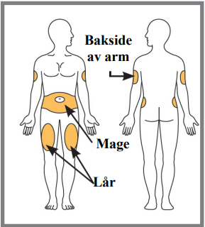 IKKE injiser i områder der huden er tynn, har blåmerker, er rød eller hard, eller der du har arr eller strekkmerker. IKKE injiser nærmere enn 2,5 cm fra navlen.