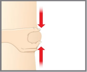 Klem forsiktig og hold tak i en hudfold der du vil injisere.