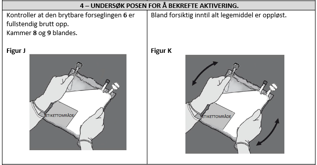 Den endelige rekonstituerte oppløsningen oppnås etter anbrudd av den brytbare forseglingen på posen med to kammer, og blanding av innholdet (pulver og oppløsningsvæske) inntil pulveret er løst fullstendig opp.
