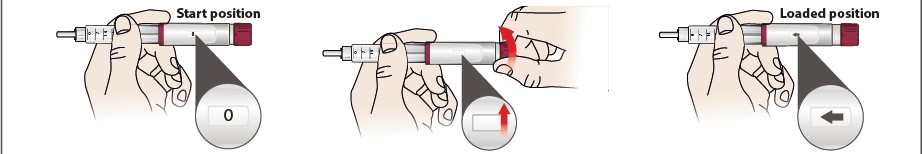 Fest en ny kanyle på den ferdigfylte pennen still inn dosen i displayvinduet ved å vri knappen for doseinnstilling.