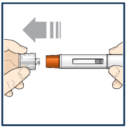 Hold den ferdigfylte pennen med den ene hånden og dra forsiktig hetten rett av med den andre hånden.