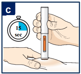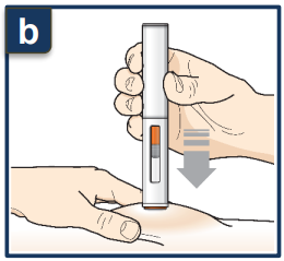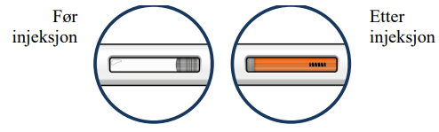 Når du setter injeksjonen, hører du først ett klikk, som forteller deg at injeksjonen har startet. Press den ferdigfylte pennen ned og hold den nede i 15 sekunder til du hører det andre klikket.