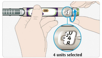 Dosevelgeren på Toujeo DoubleStar penn justeres i trinn på 2 enheter.