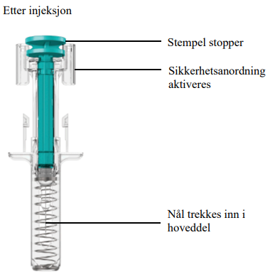 Injiser innen 5 minutter etter at nålebeskyttelsen er fjernet.