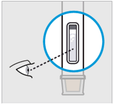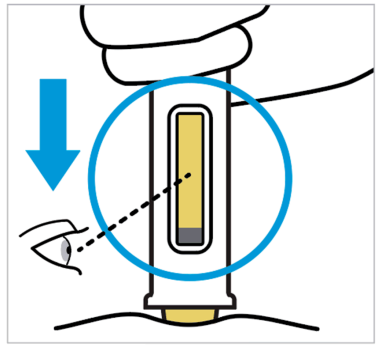 Plasser den ferdigfylte pennen rett på injeksjonsstedet med nålens gule sikkerhetsanordning mot huden og inspeksjonsvinduet mot deg.