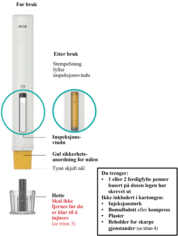 Bruk ikke dette legemidlet hvis du oppdager at legemidlet er uklart eller misfarget eller inneholder store partikler. La den ferdigfylte pennen ligge i esken etter at den er tatt ut av kjøleskapet, og la den oppnå romtemperatur ved å vente i 30 minutter før bruk.