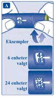 Dosevelgeren endrer antall enheter. Det er kun dosetelleren og dosepekeren som viser hvor mange enheter som er valgt per dose.