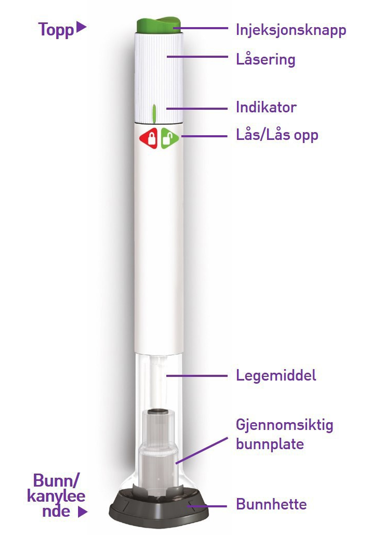 Når du presser inn den grønne injeksjonsknappen vil pennen automatisk føre kanylen inn under huden din, injisere legemidlet og trekke tilbake kanylen etter at injeksjonen er fullført.