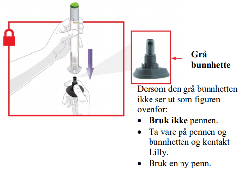 Ikke fjern bunnhetten og ikke bruk pennen. Kast pennen som anvist av lege, apotek eller sykepleier. Injisér dosen din med en annen penn.