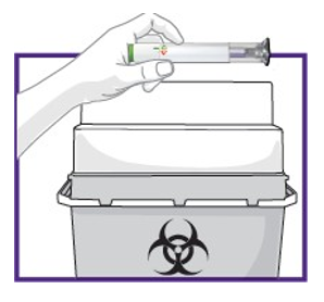 Kast pennen i en beholder som kan lukkes og der kanylen ikke kan stikke igjennom, eller slik lege, apotek eller sykepleier har anvist.