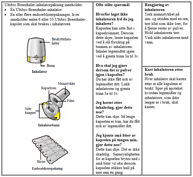 I denne pakningen finner du en inhalator og kapsler (i blistere) som inneholder medisinen som inhalasjonspulver. Bruk kun kapslene sammen med inhalatoren vedlagt i denne pakningen (Ultibro Breezhaler inhalator). Kapslene skal være i blisteret til du skal bruke dem.