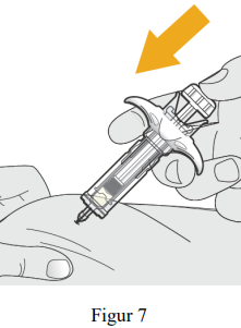 Bruk en rask, pil-lignende bevegelse for å sette kanylen inn i huden som er knepet sammen i en vinkel på omtrent 45 grader (se figur 6).