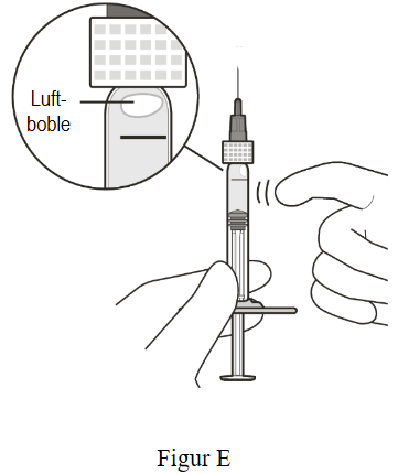 7. Hvis det er noen luftbobler, knipser du forsiktig på sprøyten med fingeren til boblene stiger til toppen (se Figur E).