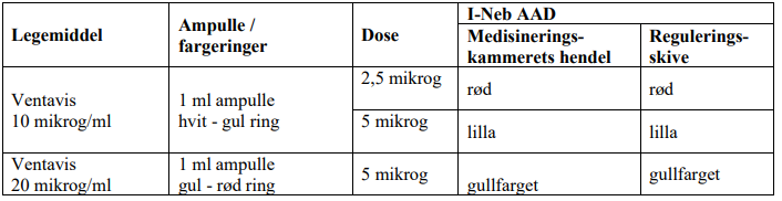 Siden I-Neb AAD-nebulisatoren kan brukes for Ventavis 10 mikrogram/ml og Ventavis 20 mikrogram/ml, viser tabellen under et sammendrag av bruksanvisningen for bruk av I-Neb for de to Ventavis-konsentrasjonene: