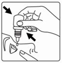 Trinn 4) Bøy hodet bakover. Bruk fingeren din til å trekke ned det nedre øyelokket. Klem forsiktig på flasken mens den fortsatt er opp-ned for å dryppe én dråpe (0,01 ml) i det første øyet. |