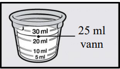 2. Tilsett ca. 25 ml vann til målebegeret på 30 ml. Mengden vann som tilsettes trenger ikke være nøyaktig.