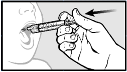 10. Sett målesprøyten inn i munnen til pasienten. Press stemplet rolig inn slik at hele volumet i målesprøyten overføres.