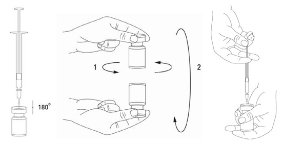 Ved behov bør nålen brukt til rekonstituering bli værende i hetteglasset og nødvendig mengde oppløsning trekkes opp med en ny steril sprøyte egnet for injeksjon.