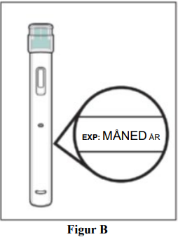 b. Se på den ferdigfylte pennen og sjekk at den ikke har sprekker eller er skadet. c. Sjekk utløpsdatoen på etiketten på den ferdigfylte pennen. Bruk ikke den ferdigfylte pennen hvis:
